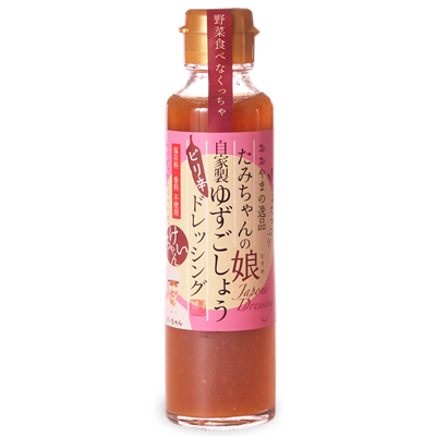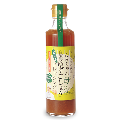 自家栽培の玉ねぎ、しょうが、自家製ゆずこしょう、その他野菜と果物をたっぷり使い具だくさんのゆずこしょうドレッシングです。